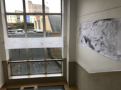 Lucia and I decided to collaborate on a project together as we both have similar drawing styles and techniques so we thought - why not? Our process was mainly focused around getting whatever was in our heads out onto the paper in whatever way it translated through our hands and bodies. We thought it would be fun to try dampened paper and include feathers into the project as they both give surprising results. The feathers kissed the paper so gently and left lines and shapes behind. We loved the juxtaposition of softer marks and harsher ones. thick black lines and soft almost translucent graphite shadows scattered across the page. During the project, we began discussing exhibitions and exhibition spaces in general and sometimes what it seems like the lack of spaces to display work within the art school. So we took matters into our own hands and began installing our work at the end of the 3rd year corridor down one of the stairways. it was a perfect spot.
